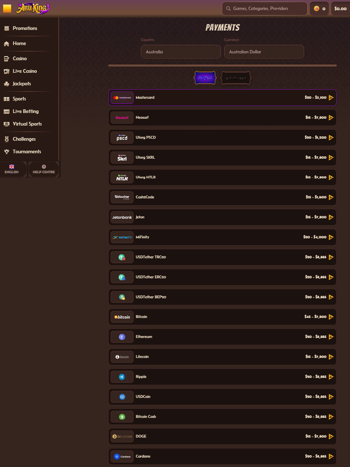 The minimum deposit at AbuKing Casino varies by payment method, ranging from $15 for most cryptocurrencies and some traditional methods to $90 for certain e-wallet options. This low minimum makes the platform accessible to casual players while still offering substantial maximum limits for high-rollers.