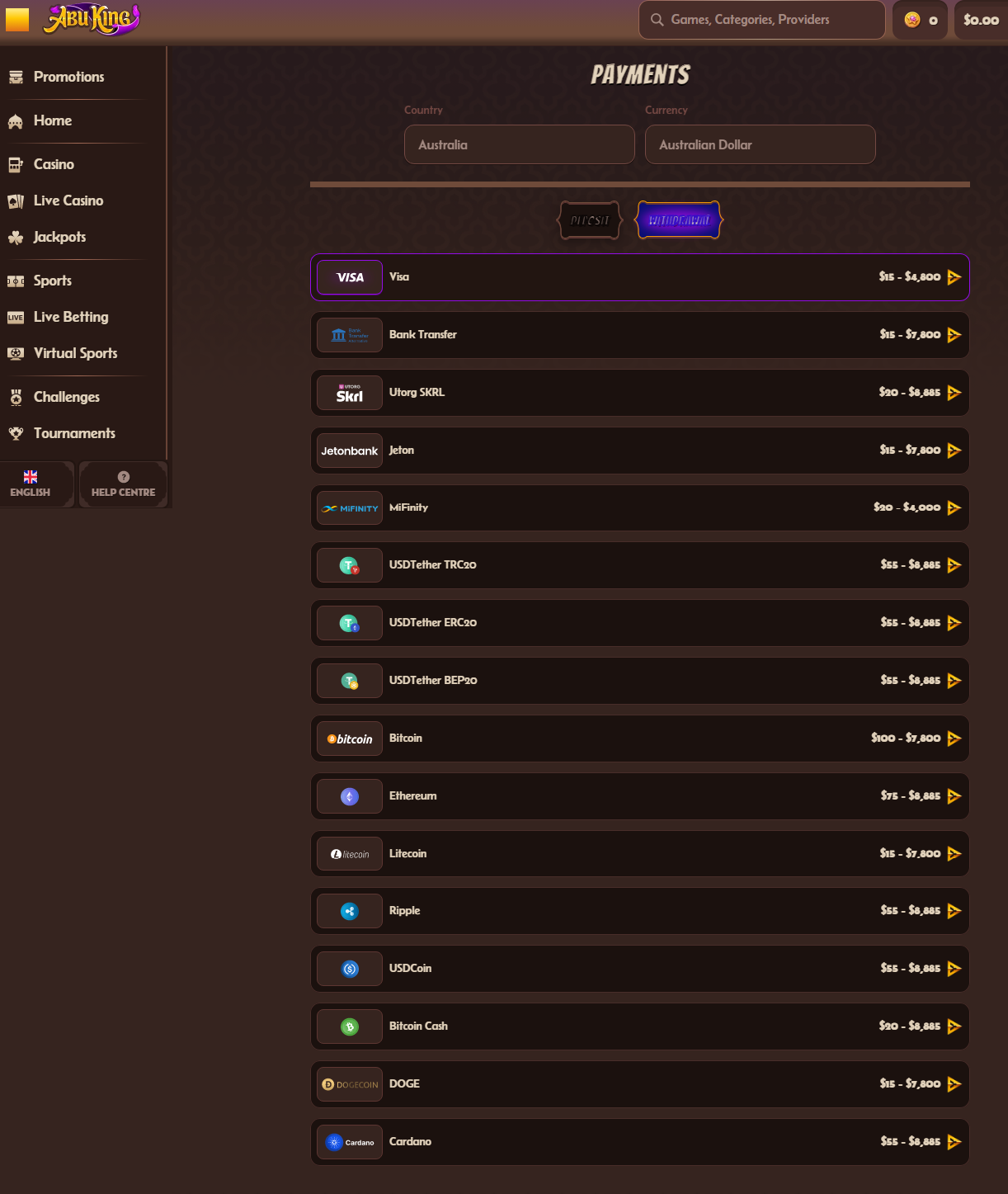 Based on the platform's payment structure, AbuKing Casino offers one of the most diverse payment ecosystems available to Australian players. The casino supports both deposit and withdrawal transactions across multiple channels, ensuring maximum convenience for users.