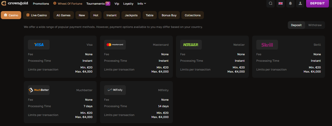 The CrownGold Casino site provides multiple deposit methods with competitive terms and instant processing for most options.
