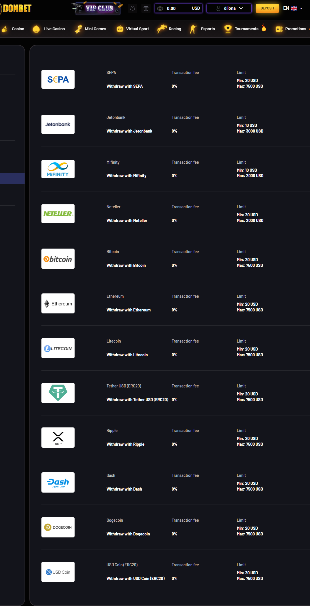 Donbet shines in this area with deep crypto integration, including Bitcoin, Ethereum, USDT, BNB, LTC , and more. Withdrawals are typically processed within 5–10 minutes. No KYC is required in most cases, making it appealing to privacy-focused players.