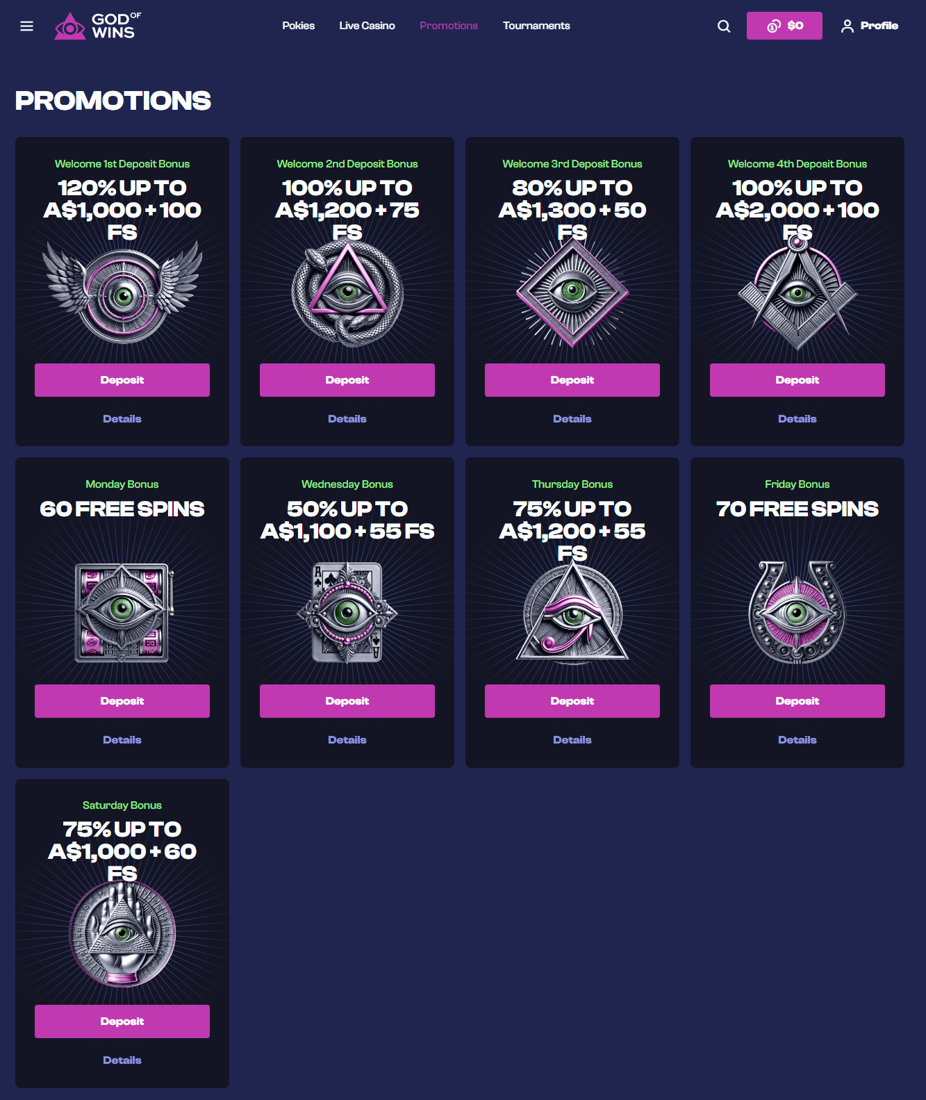 The welcome bonus structure demonstrates remarkable generosity, with the God of Wins Casino free spins component adding significant value to each deposit tier. Players can potentially claim up to A$5,500 in bonus funds plus 325 free spins across their first four deposits.