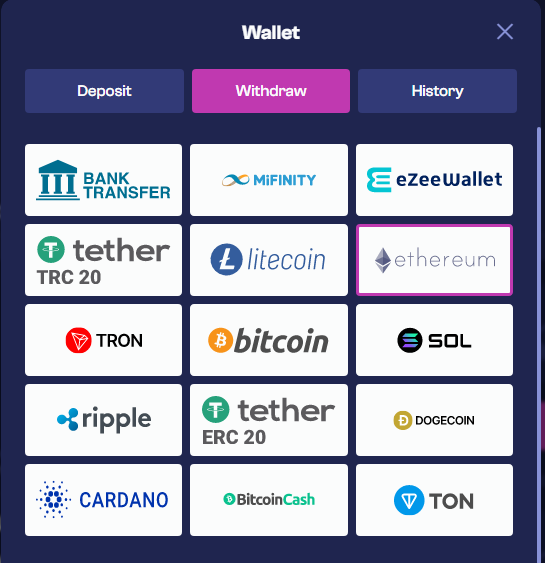 The platform supports 12 major cryptocurrencies including Bitcoin, Ethereum, Litecoin, Tether (both TRC20 and ERC20), Ripple, Cardano, Solana, Tron, Dogecoin, Bitcoin Cash, and Toncoin. All supported cryptocurrencies are available for both deposits and withdrawals.