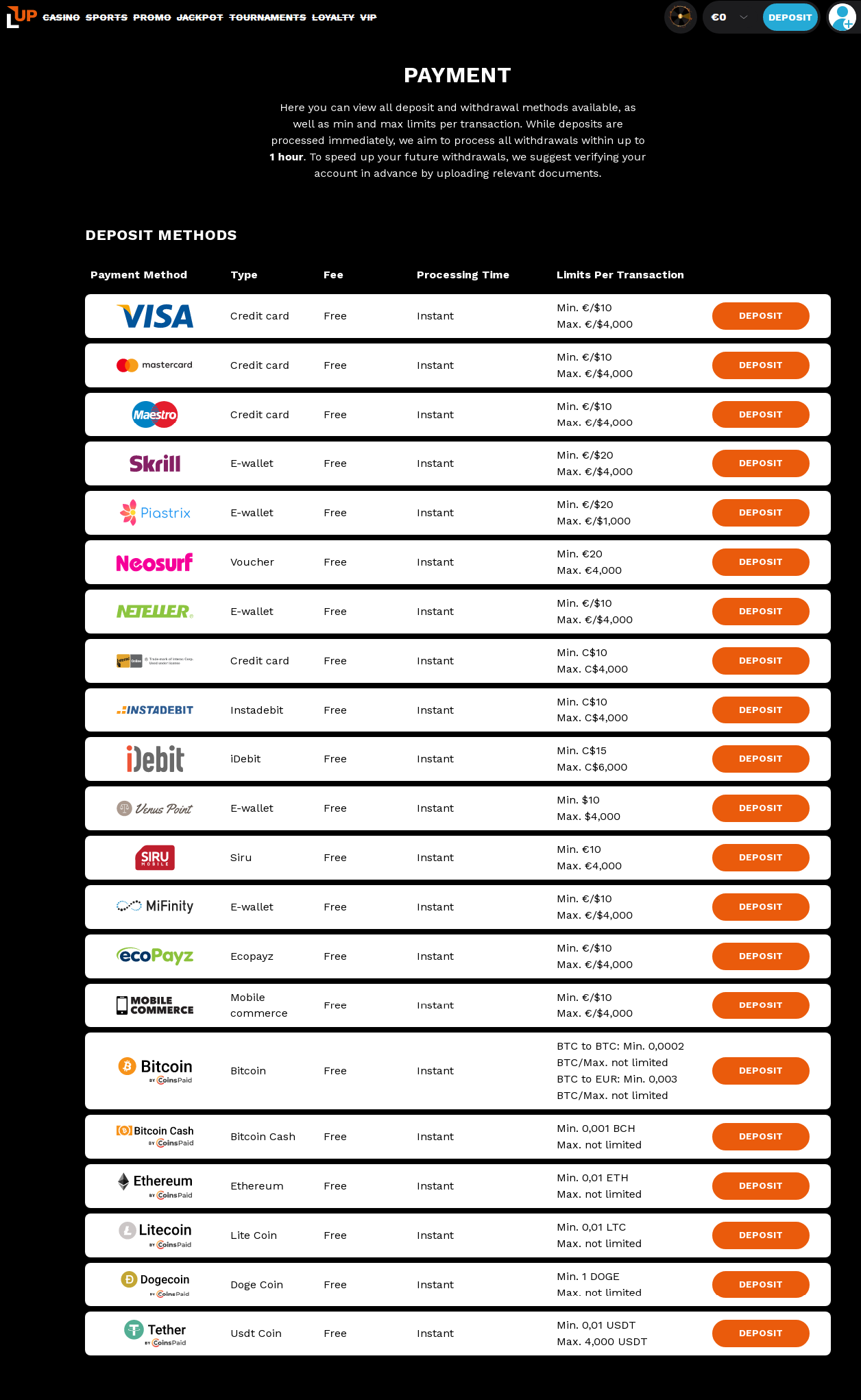 The minimum deposit amount varies by payment method, with most options requiring a minimum of €/$10. Cryptocurrency deposits may have different minimums based on current exchange rates and network fees.