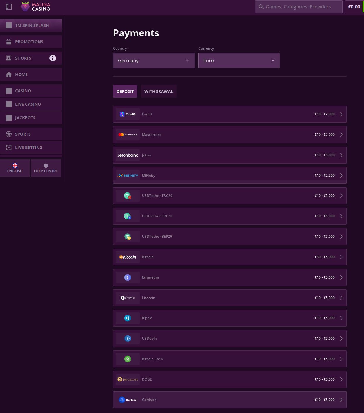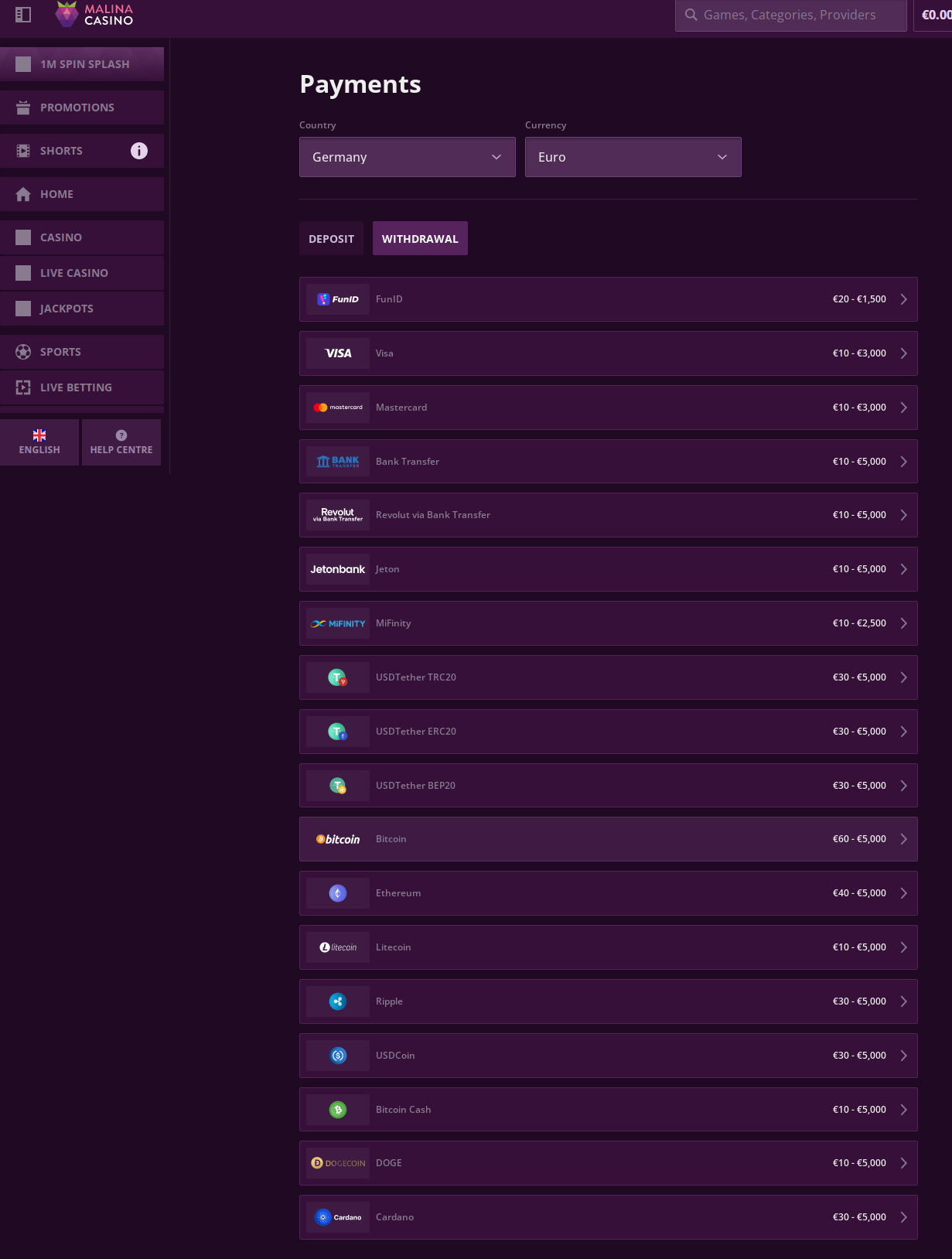 The Malina Casino pl platform (Polish interface) also supports the same crypto options, demonstrating the site's commitment to maintaining consistent cryptocurrency services across all regional versions.