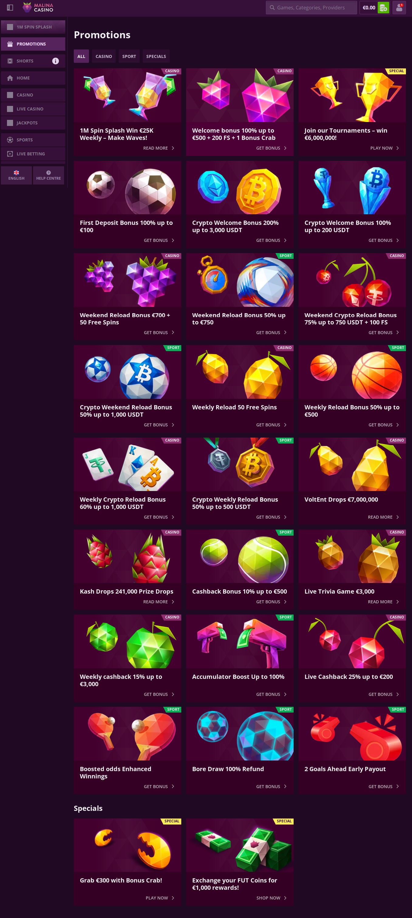 Bonus and promotional offers at Malina Casino featuring welcome packages, free spins, and exclusive crypto player rewards