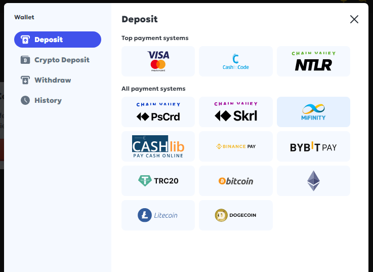 MegaRich Casino supports Bitcoin (BTC), Ethereum (ETH), Litecoin (LTC), Tether (TRC20), and Dogecoin (DOGE), with minimum deposits of €20 for all cryptocurrencies.