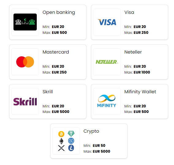 • Minimum Withdrawal : Most methods have a minimum withdrawal limit of EUR 20, except for crypto, which requires a minimum of EUR 50.