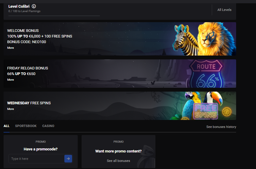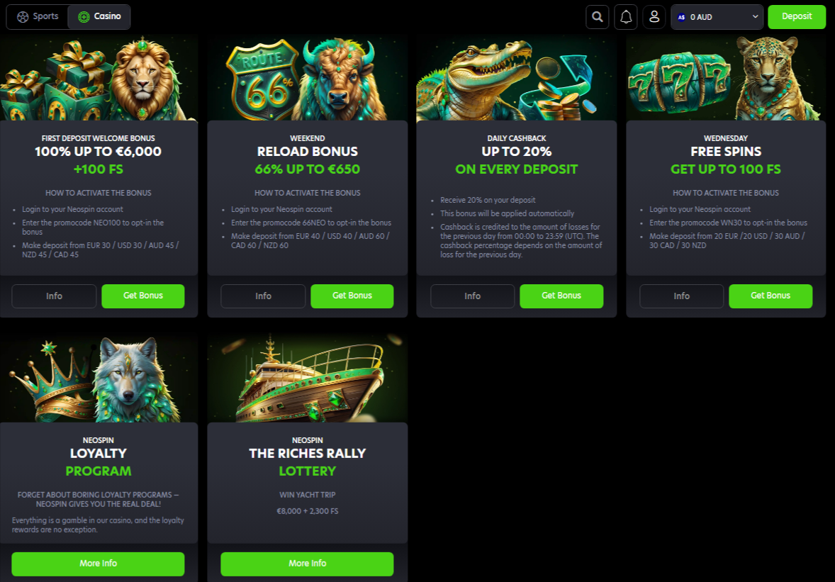 Neospin Casino offers a generous welcome bonus package across the first three deposits, including match bonuses and free spins. Additional promotions include weekly reloads, cashback offers, and exclusive tournaments for active players.