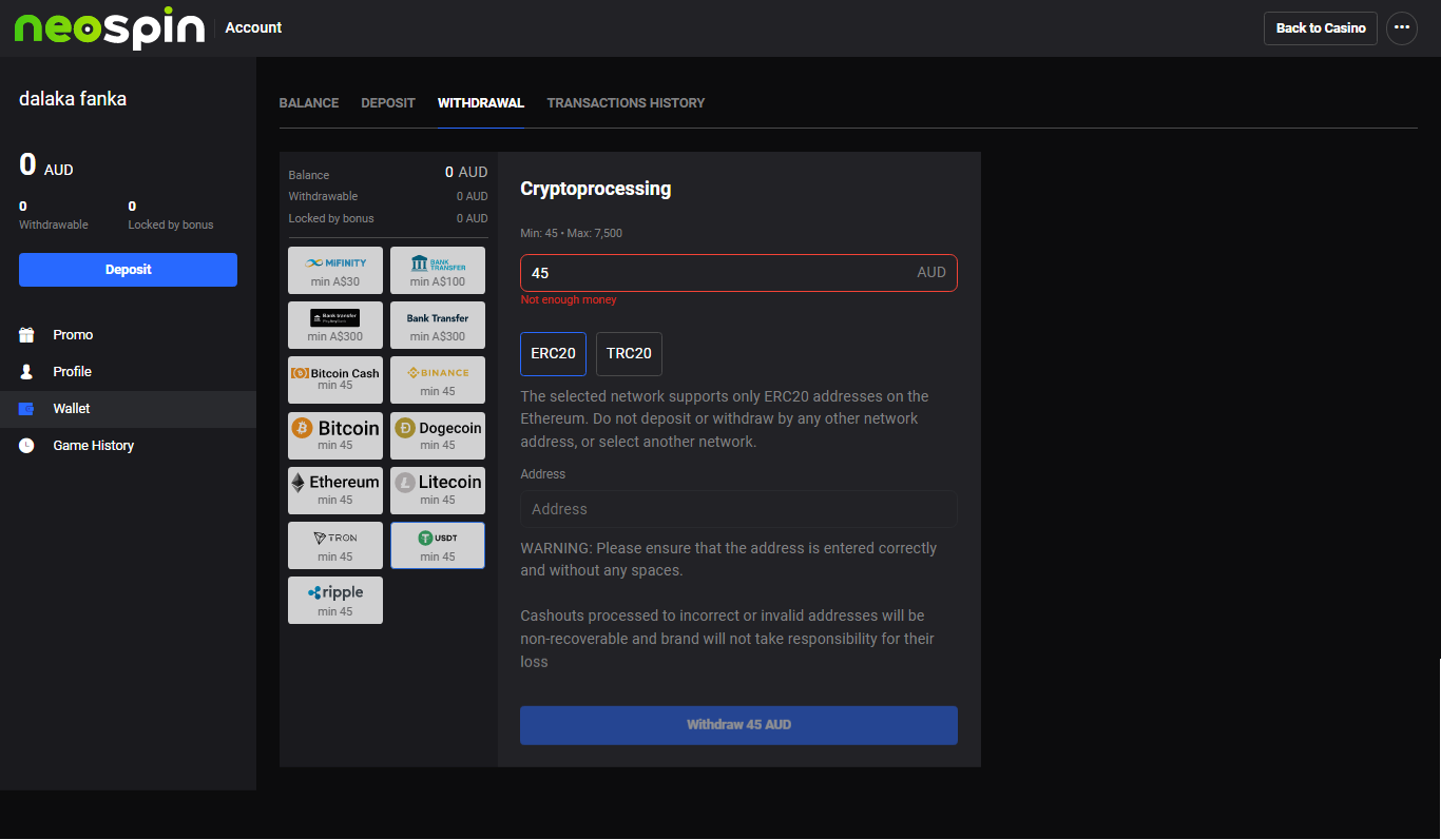When it comes to withdrawing winnings, Neospin Casino offers a variety of options, each with its own set of terms regarding fees, processing times, and limits. Some methods, such as bank transfers, may incur fees or have longer processing times compared to instant cryptocurrency withdrawals.