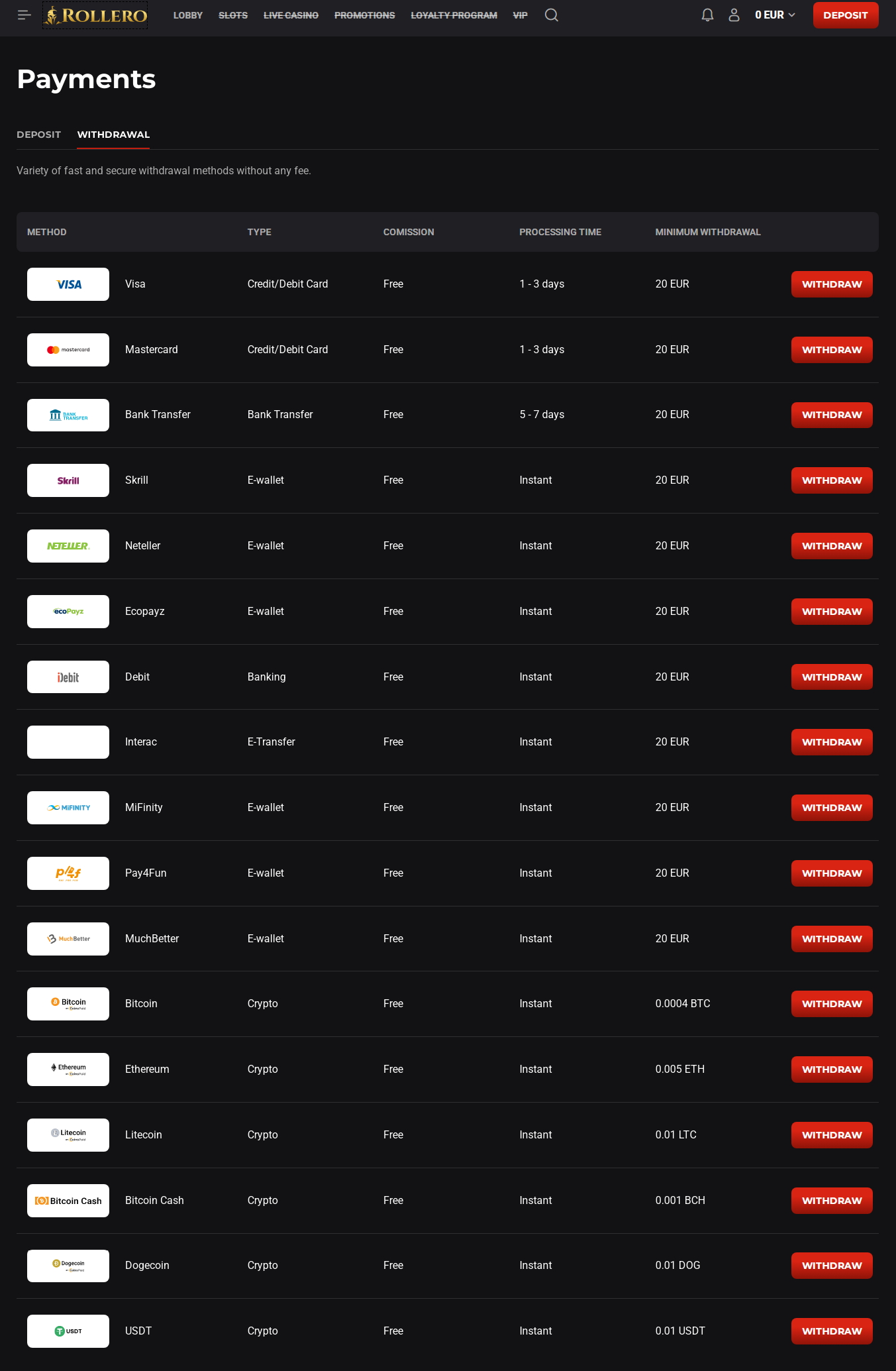 Rollero Casino supports 10+ cryptocurrencies including Bitcoin, Ethereum, Litecoin, Bitcoin Cash, Dogecoin, Tether, Ripple, Binance Coin, Cardano, and Tron.