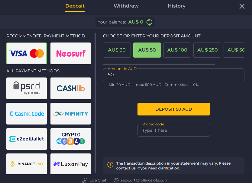 The minimum deposit is AU$20 across all payment methods, making the platform accessible to players with various bankroll sizes. Maximum deposits vary by method, with cryptocurrency options supporting up to AU$50,000 for high-roller players, while traditional methods typically cap at AU$1,100-AU$5,000.