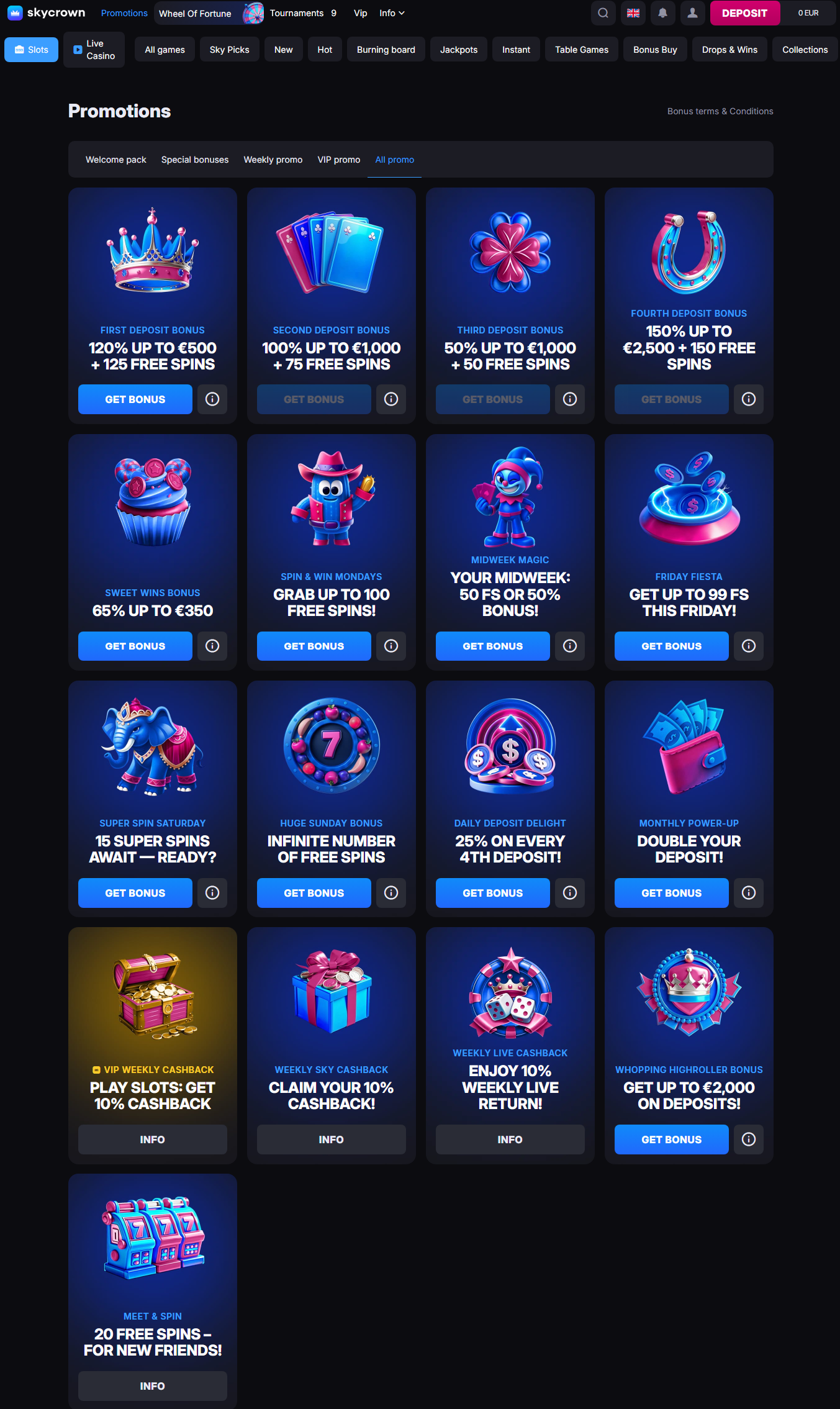 SkyCrown offers a multi-part welcome bonus totaling up to €500 (or equivalent crypto) plus 225 free spins across the first five deposits. Additional promotions include weekly cashback , reload bonuses , and missions for loyal players. Its VIP program grants increasingly generous rewards and exclusive perks.