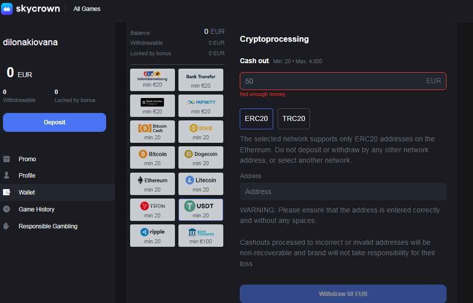Lucky Dreams supports around 15 cryptocurrencies , such as BTC, ETH, XRP, TRX , and USDT . Payments are processed quickly, with strong encryption and no added fees. However, unlike SkyCrown, it does not support as many alternative coins or advanced blockchain tools.