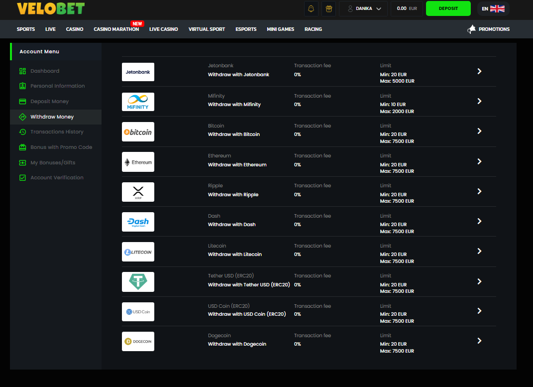 Velobet Casino supports nine major cryptocurrencies including Bitcoin, Ethereum, Bitcoin Cash, Ripple, Dash, Litecoin, Tether USD (ERC20), USD Coin (ERC20), and Dogecoin. All cryptocurrency transactions feature zero fees and competitive processing times.