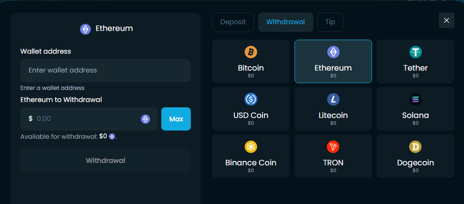 Winna shines in this area, offering broad support for BTC, ETH, LTC, DOGE, and USDT (TRC20). It’s a true crypto casino, with no fiat options and no KYC for most withdrawals, which appeals to privacy-first users.