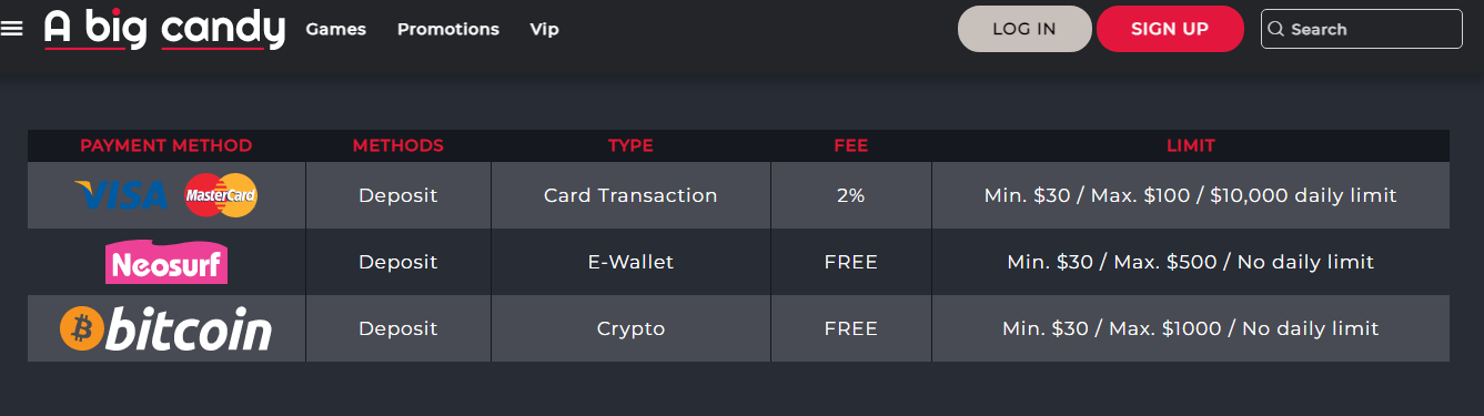 This image displays comprehensive deposit information for A Big Candy Casino, showing payment methods including Bitcoin, Neosurf, and traditional cards with their respective fees and transaction limits.
