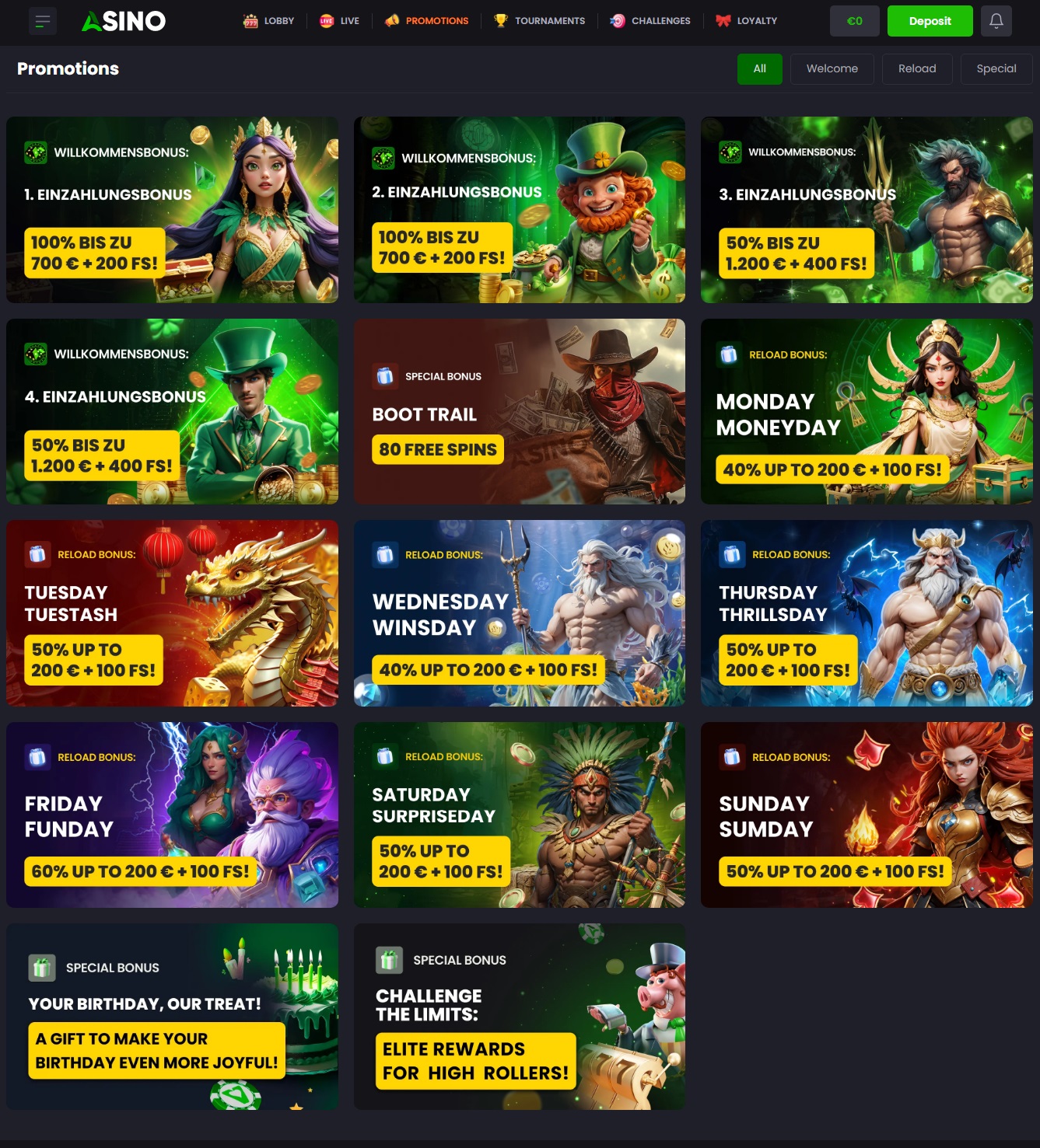 The Asino Casino no deposit bonus program, while not offering traditional no-deposit rewards, compensates with an exceptional welcome package that extends across multiple deposits: