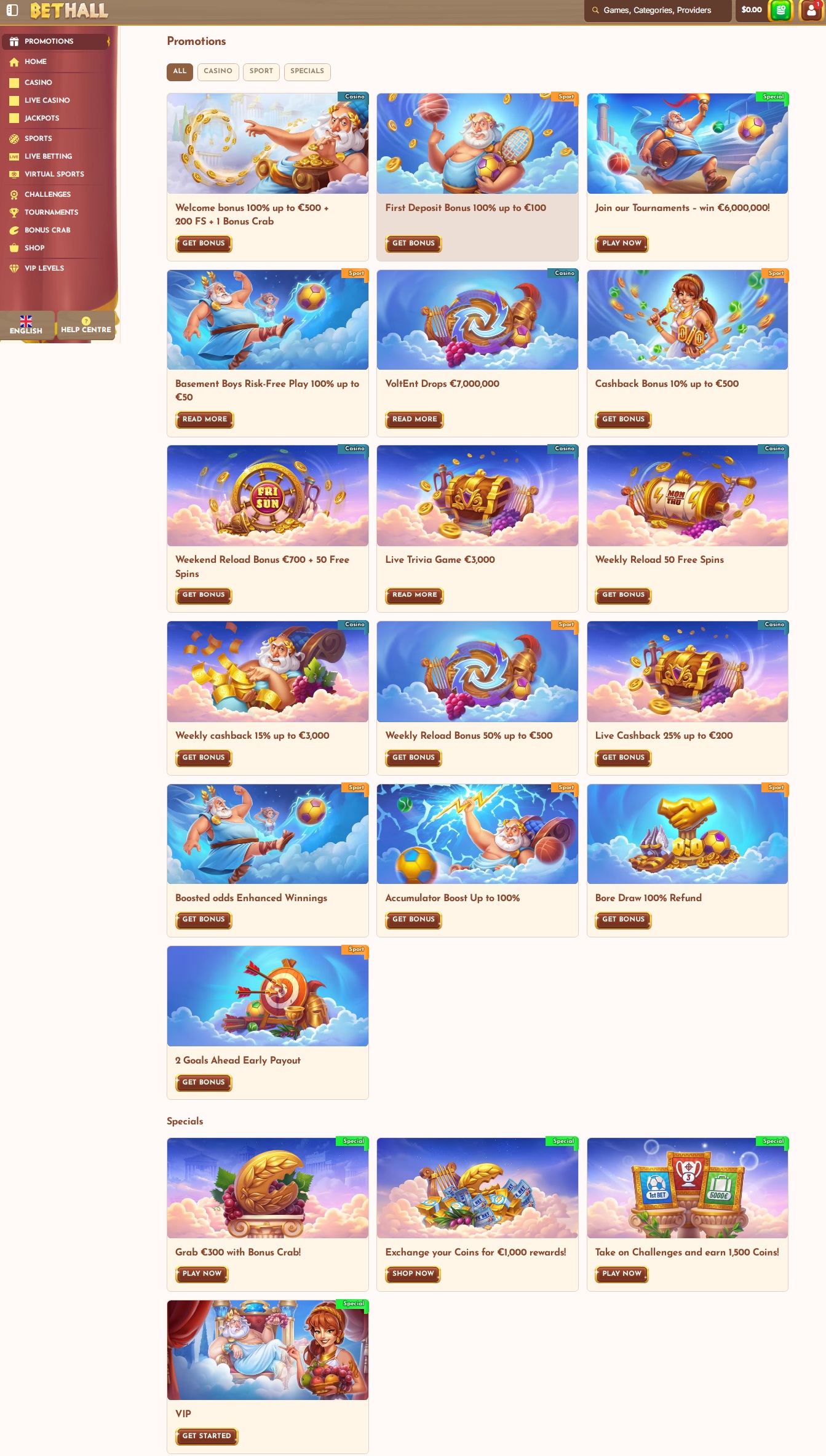 Currently, BetHall Casino focuses on deposit-based promotions rather than no deposit offers. However, they provide exceptional value through their 100% welcome bonus up to €500 plus 200 free spins and the unique Bonus Crab feature.
