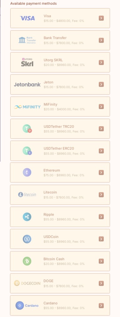 The minimum deposit varies by payment method. Traditional payment methods like Mastercard and e-wallets require $10-$30, while cryptocurrency deposits require a minimum of $40 across all supported digital assets.