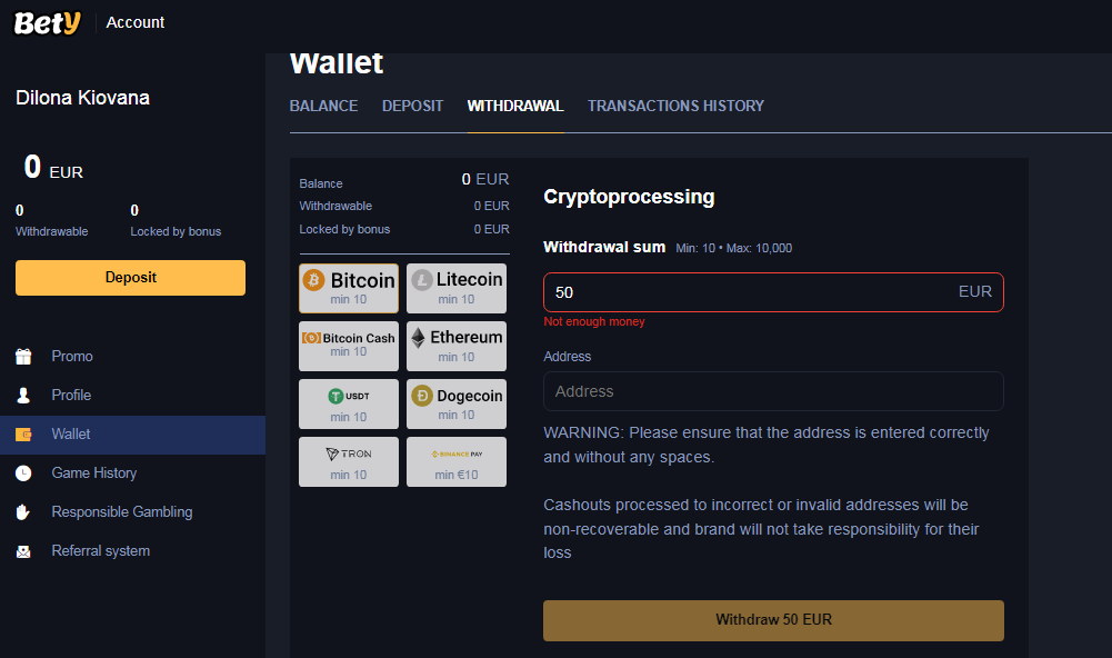 Bety Casino supports major cryptocurrencies, including Bitcoin, Ethereum, and Litecoin. Deposits and withdrawals are processed quickly, with low fees and no hidden charges. The casino emphasises security and transparency, offering provably fair games for crypto bettors.