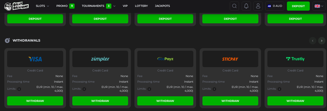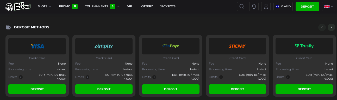 All withdrawal methods at Billy Billion Casino process instantly, regardless of the payment provider chosen. Whether using Visa, Zimpler, Payz, SticPay, or Trustly, players can access their winnings immediately without waiting periods or processing delays that are common at other online casinos.
