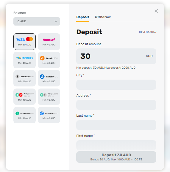 Minimum deposits vary by payment method: 30 AUD for traditional options like Visa/Mastercard, and 40 AUD for cryptocurrency payments. These thresholds make the platform accessible to casual players.