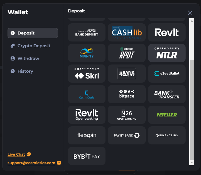 The withdrawal system mirrors the deposit infrastructure's sophistication, providing players with multiple secure options for accessing their winnings. The CosmicSlot Casino withdrawal process prioritises both speed and security, ensuring players can efficiently manage their funds according to their preferences.