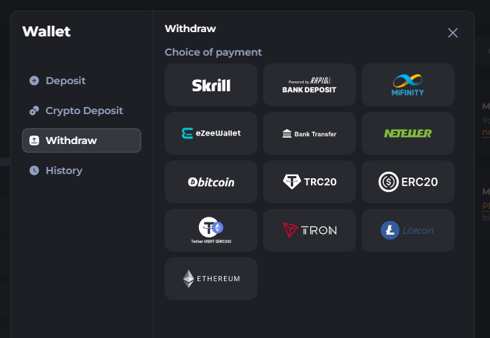 Absolutely. The platform supports over 15 different payment methods, including traditional options like bank transfers, Skrill, Neteller, and MiFinity, alongside comprehensive cryptocurrency support.