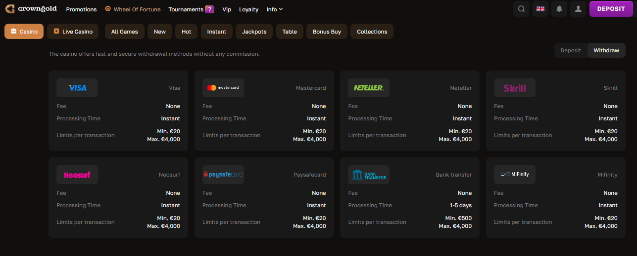 Most withdrawal methods at CrownGold Casino process instantly, including Visa, Mastercard, Neteller, Skrill, Neosurf, Paysafecard, and Mifinity. Only bank transfers take 1-5 days to complete.