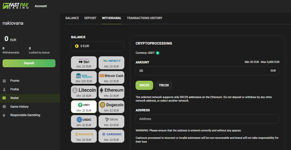 A: FastPay Casino supports Bitcoin, Ethereum, Litecoin, Tether, Bitcoin Cash, Cardano, and Binance Coin, among others.