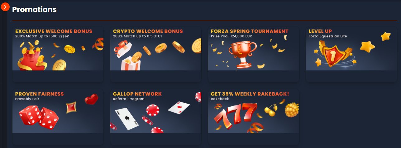 Forza.Bet hosts over 2,500 games, including slots, table games, and live dealer experiences. The casino partners with well-known providers such as BGaming, Pragmatic Play, and Endorphina. While its collection isn’t as large as some competitors, the games are well-curated, and the interface makes it easy to explore new titles.