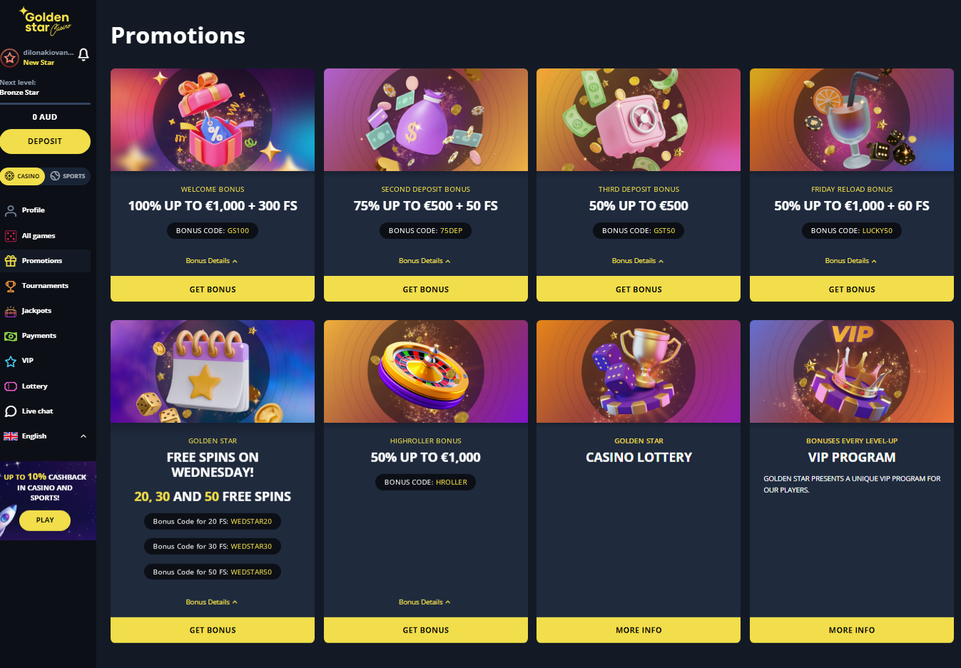 Golden Star Casino offers a generous welcome bonus package that includes match bonuses and free spins across the first four deposits. Additionally, players can enjoy weekly reload bonuses, cashback offers, tournaments, and a VIP rewards program.