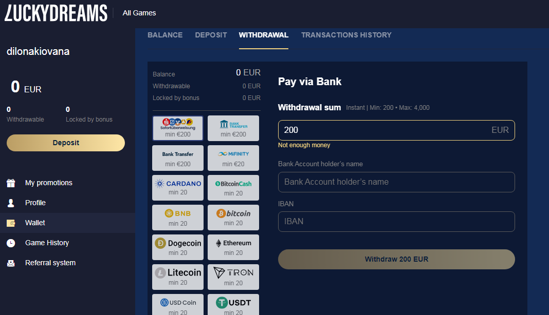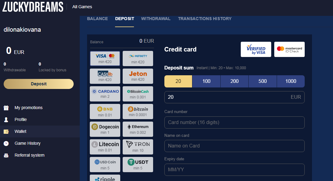 Lucky Dreams accepts over 15 cryptocurrencies, including BTC, ETH, XRP, USDT, TRX, and more. Deposits and withdrawals are fast and fee-free, and the platform is well-optimised for blockchain users. However, it does not include staking, token economies, or provably fair gaming features.