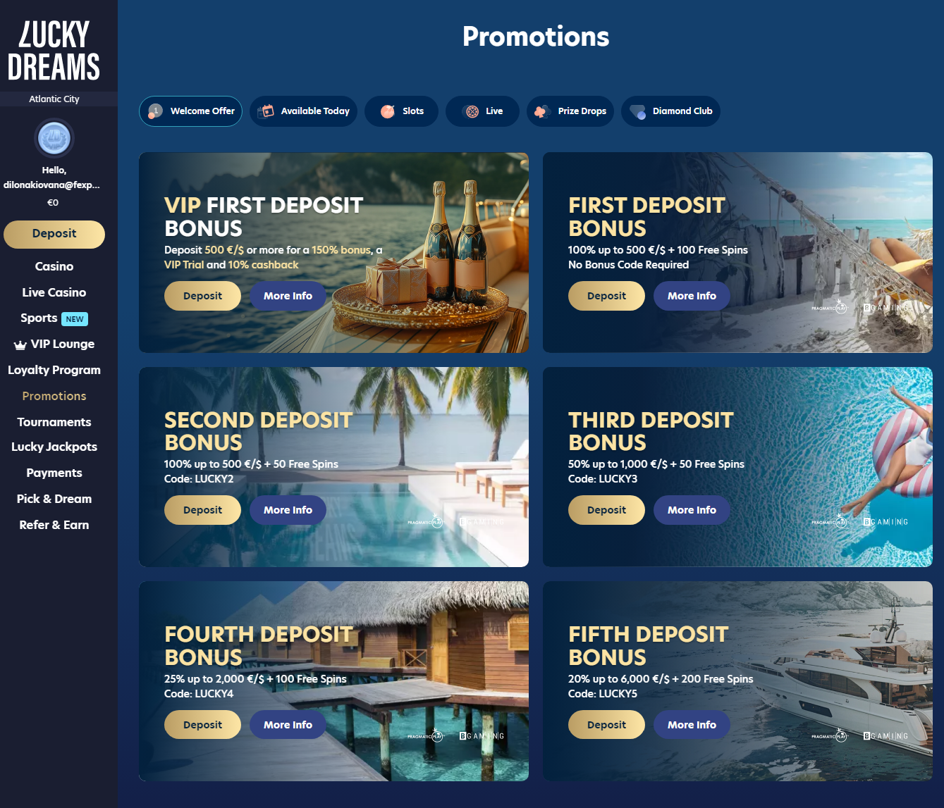 Lucky Dreams delivers one of the most generous bonus systems in the market: up to €3,000 and 300 free spins over the first four deposits. Regular promotions include weekly free spins, reload bonuses, and an evolving loyalty program with tiered benefits. This structure is ideal for long-term players and bonus hunters.