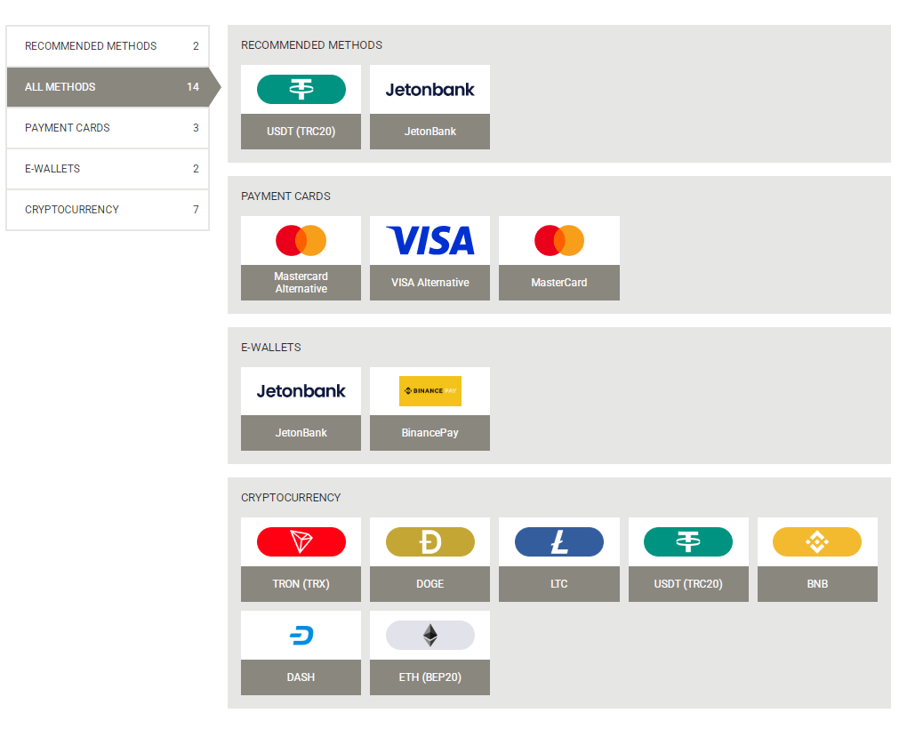 BTC, ETH, LTC, DOGE, DASH, USDT |