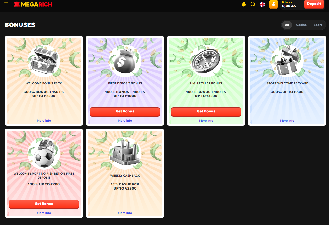 One of the most compelling aspects of Mega Rich Casino is its generous bonus system, designed to cater to different player preferences and bankrolls.