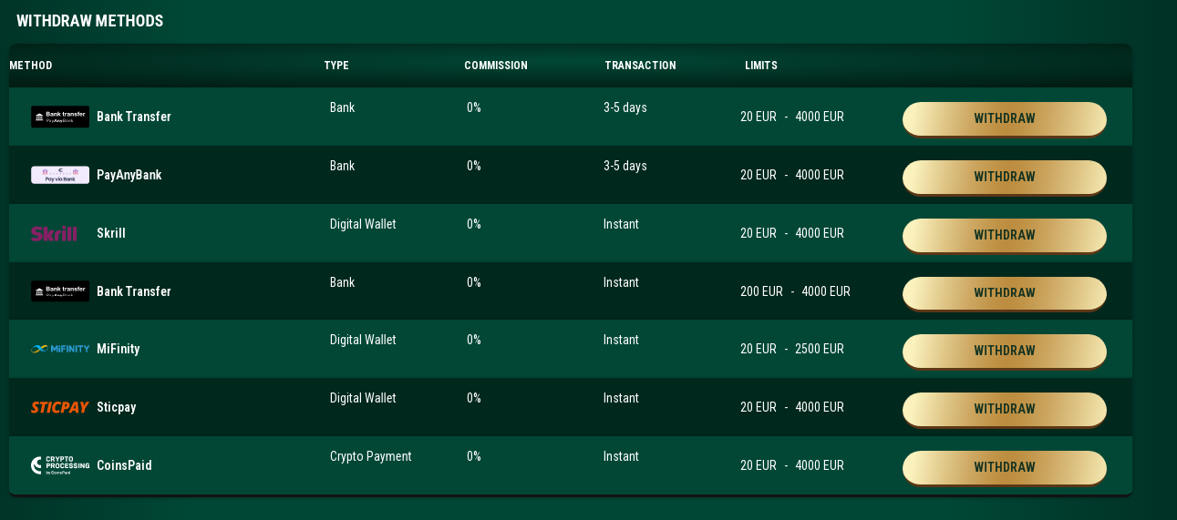 Bank Transfer Bank 0% 3-5 days 20 - 4000 High