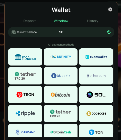 The platform accepts an extensive range of digital currencies, including Bitcoin (BTC), Ethereum (ETH), Litecoin (LTC), Ripple (XRP), Tether on multiple networks (TRC20 and ERC20), Cardano (ADA), Dogecoin (DOGE), Bitcoin Cash (BCH), Solana (SOL), Tron (TRX), and TON. This comprehensive selection ensures players can use their preferred digital assets.