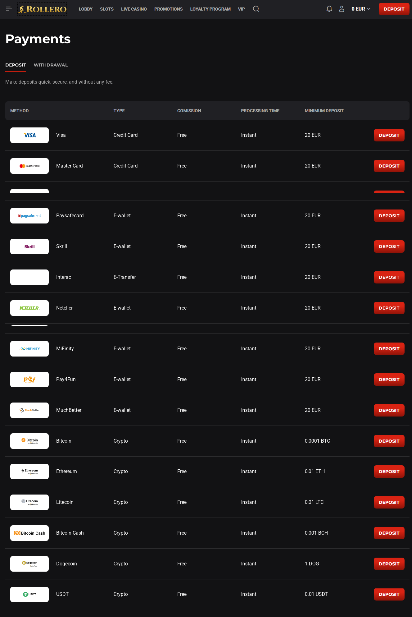Rollero Casino supports 10+ cryptocurrencies, including Bitcoin, Ethereum, Litecoin, Bitcoin Cash, Dogecoin, Tether, Ripple, Binance Coin, Cardano, and Tron.