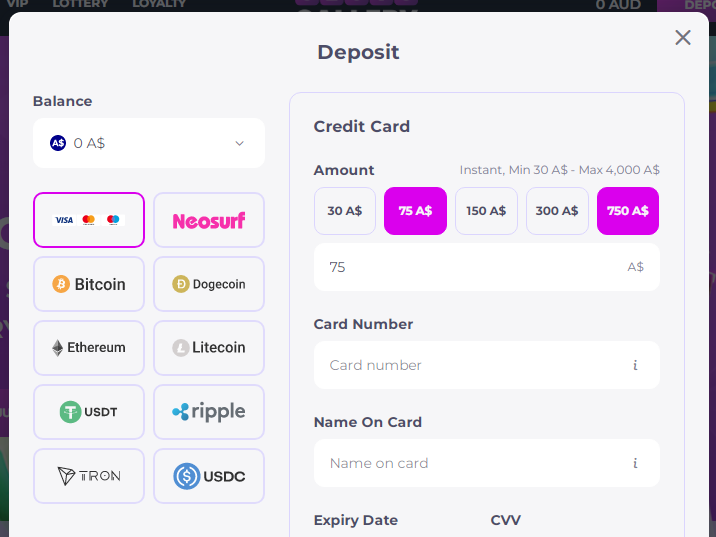 Cryptocurrency withdrawals range from a minimum of 20 A$ to a maximum of 6,000 A$ per transaction. Processing times are typically instant for crypto withdrawals, making them the fastest option available on the platform.