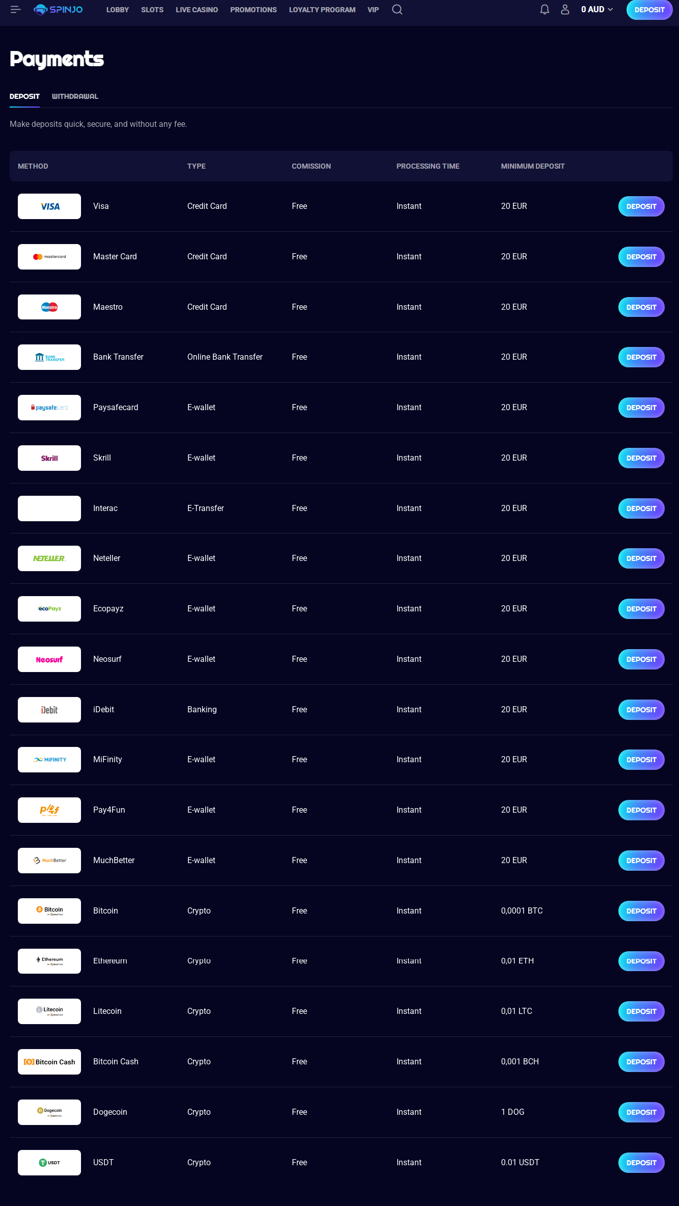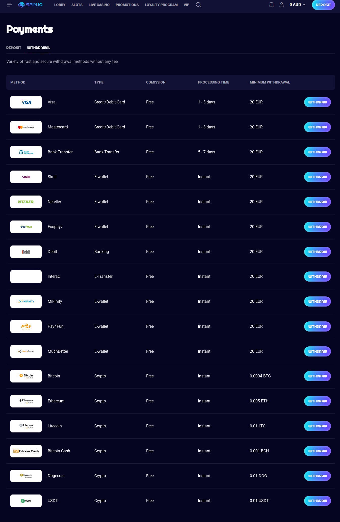 The platform supports six major cryptocurrencies, including Bitcoin, Ethereum, Litecoin, Bitcoin Cash, Dogecoin, and USDT. All cryptocurrency transactions are processed instantly with zero commission fees, making them ideal for Australian players seeking quick and cost-effective banking options.