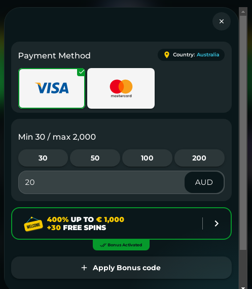 Australian players can deposit using VISA and Mastercard with a minimum deposit of A$30 and a maximum of A$3,300. The platform also supports custom deposit amounts starting from A$20. Additional cryptocurrency payment options are expected to be available, though specific details weren't visible in the current interface.