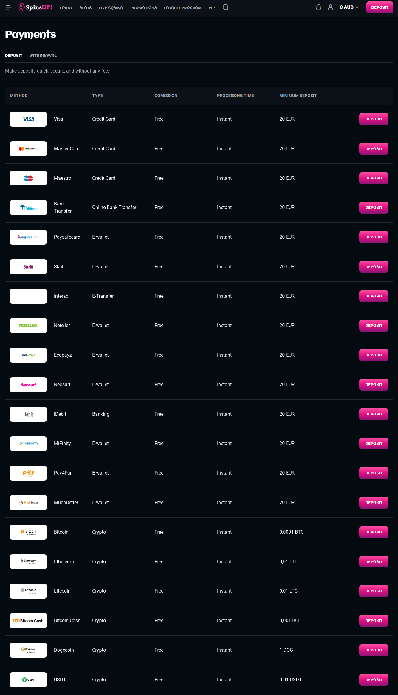 Minimum deposits are standardised at 20 EUR for traditional payment methods and e-wallets, with cryptocurrency minimums varying by currency (0.001 BTC, 0.01 ETH, 0.01 LTC, 0.001 BCH, 1 DOGE, 0.01 USDT). These thresholds make the platform accessible to casual players while supporting operational requirements.
