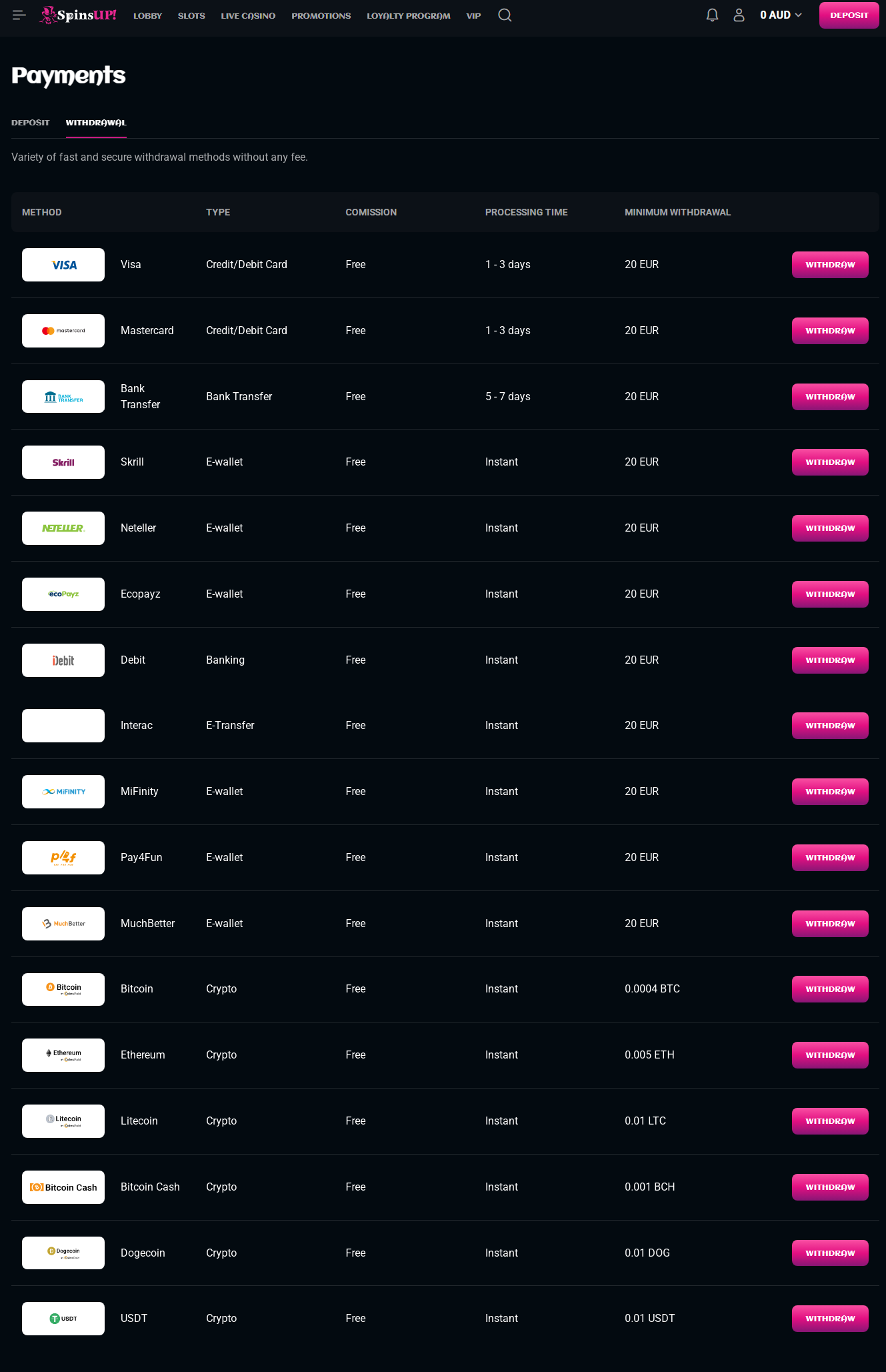 All withdrawal methods show zero commission charges, which is uncommon in the online casino industry. This fee-free structure provides significant value for Australian players who often face high transaction costs with international gaming platforms, particularly for cryptocurrency withdrawals.