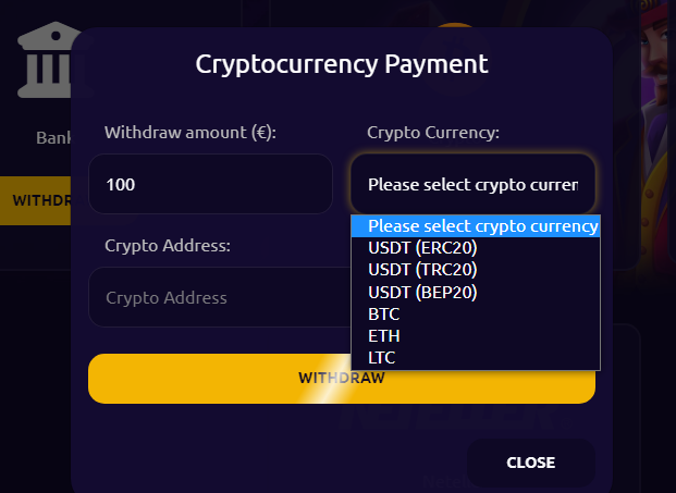 SpinTime leads the pack with support for over 10 cryptocurrencies, including Bitcoin, Ethereum, Litecoin, Dogecoin, USDT, Tron, and Ripple. Most deposits are processed instantly, and withdrawals in BTC or ETH typically take under 10 minutes.