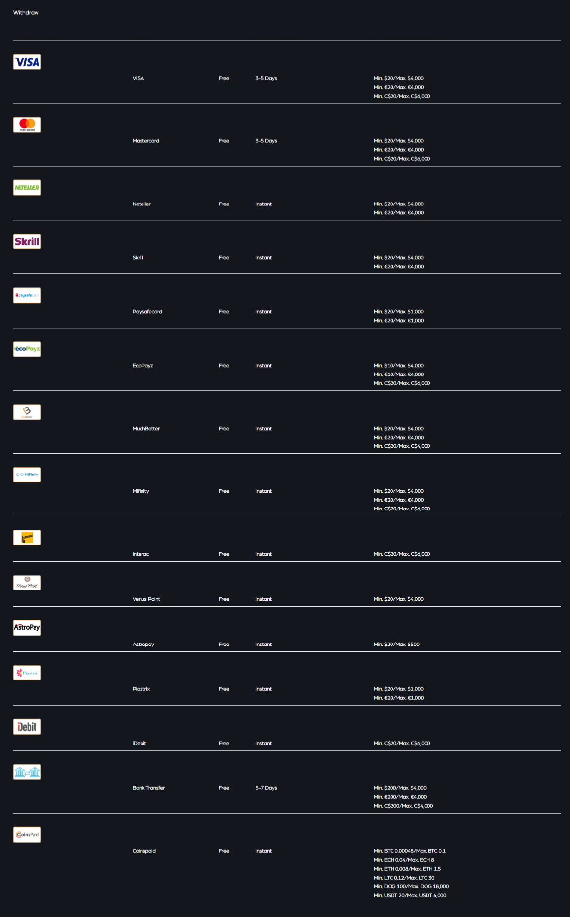 Withdrawal Method Processing Time Fees Minimum Withdrawal Maximum Withdrawal