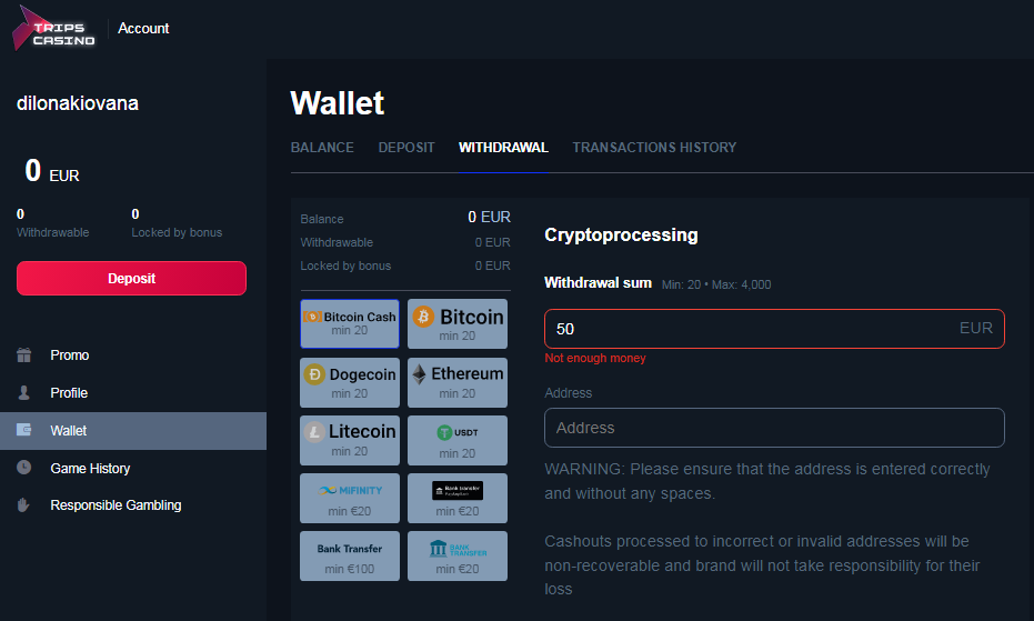 The platform clearly states that cashouts processed to incorrect or invalid addresses are non-recoverable, emphasising the importance of address verification.