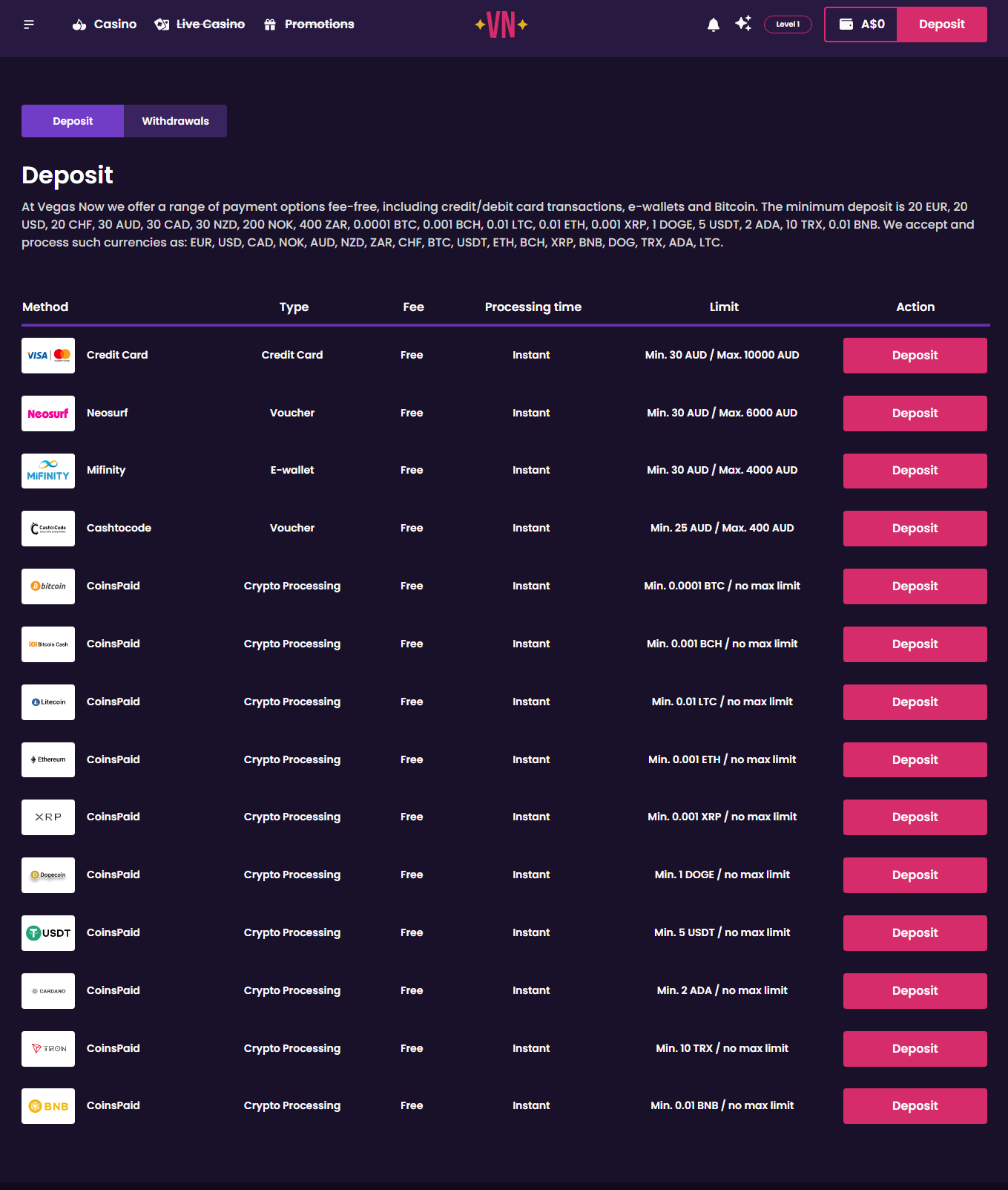 Based on a comprehensive analysis of Vegas Now Casino's payment systems, the platform supports an extensive range of both traditional and cryptocurrency payment methods, making it one of the most versatile gaming destinations available to Australian players.