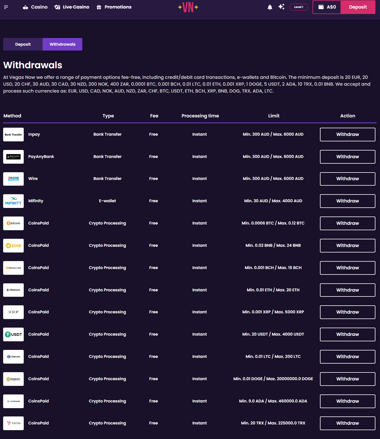Vegas Now Casino does not charge any fees for cryptocurrency deposits or withdrawals. However, standard blockchain network fees may apply depending on the specific cryptocurrency used and current network conditions.